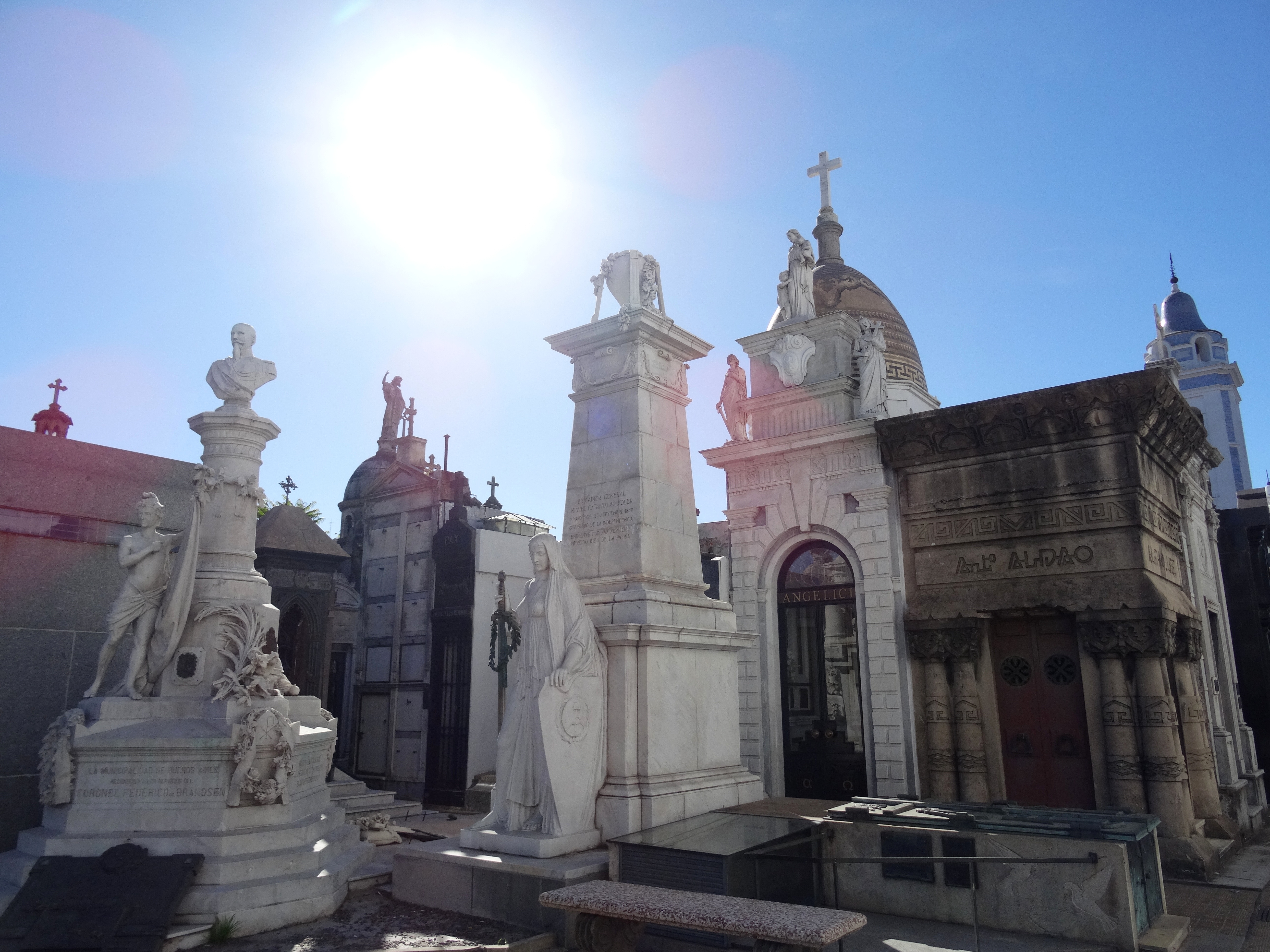 Über die Avenida 9 de Julio ging es zum Plaza San Martín. Natürlich durften auf der Tour der Torre Monumental und die Iglesia del Pilar nicht fehlen. Endpunkt war El Cementerio de la Recoleta. Dieser Friedhof erhebt sich wie eine Stadt in der Stadt mit hunderten „Gebäuden“, die Familiengräber sind. Es gibt teilweise sogar Straßennamen, die zu den Gräbern bekannter Familien führen. Die Türen sind zwar mit Vorhängeschlössern verriegelt, aber teilweise einen Spalt geöffnet, so dass man die Särge sehen, fast anfassen kann. Gruselig!